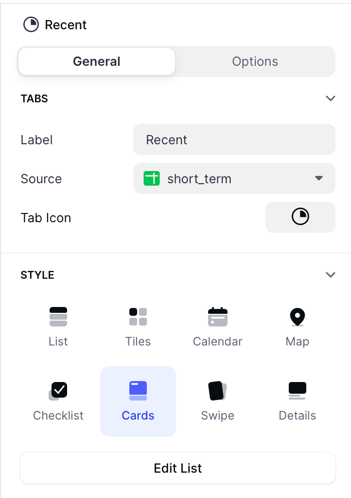 Let's change the Label of the tab to Recent, update the icon and select Cards style. Make sure the source for Recent is using the short_term tab.