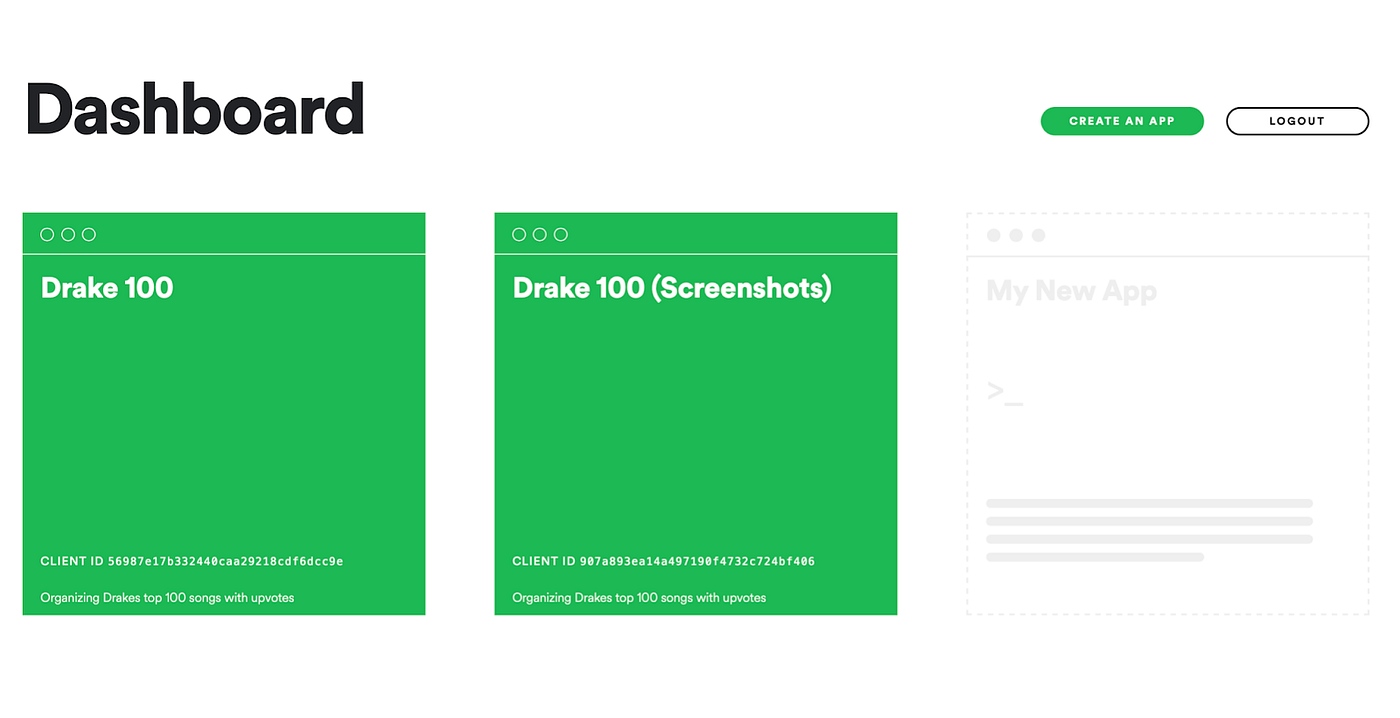 Let's start by creating the app. First thing we need to do is register our app with Spotify. On your dashboard screen click Create An App.