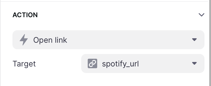 The last part we want to edit on this screen is the Action section. Let's make it so any tap on the card opens the song in Spotify. We can do this since we are passing through the Spotify URL as part of our track info.