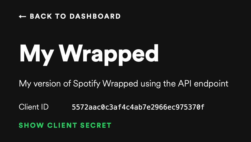 Our Client ID is a unique identifier and our Client Secret is the key that we'll pass in to secure calls to the Spotify Web API. Again, we will likely stick these in an .env file when we upload to GitHub to make sure we don't accidentally expose them, but for now you can drop them into a Jupyter notebook cell with the variables client_id and client_secret.