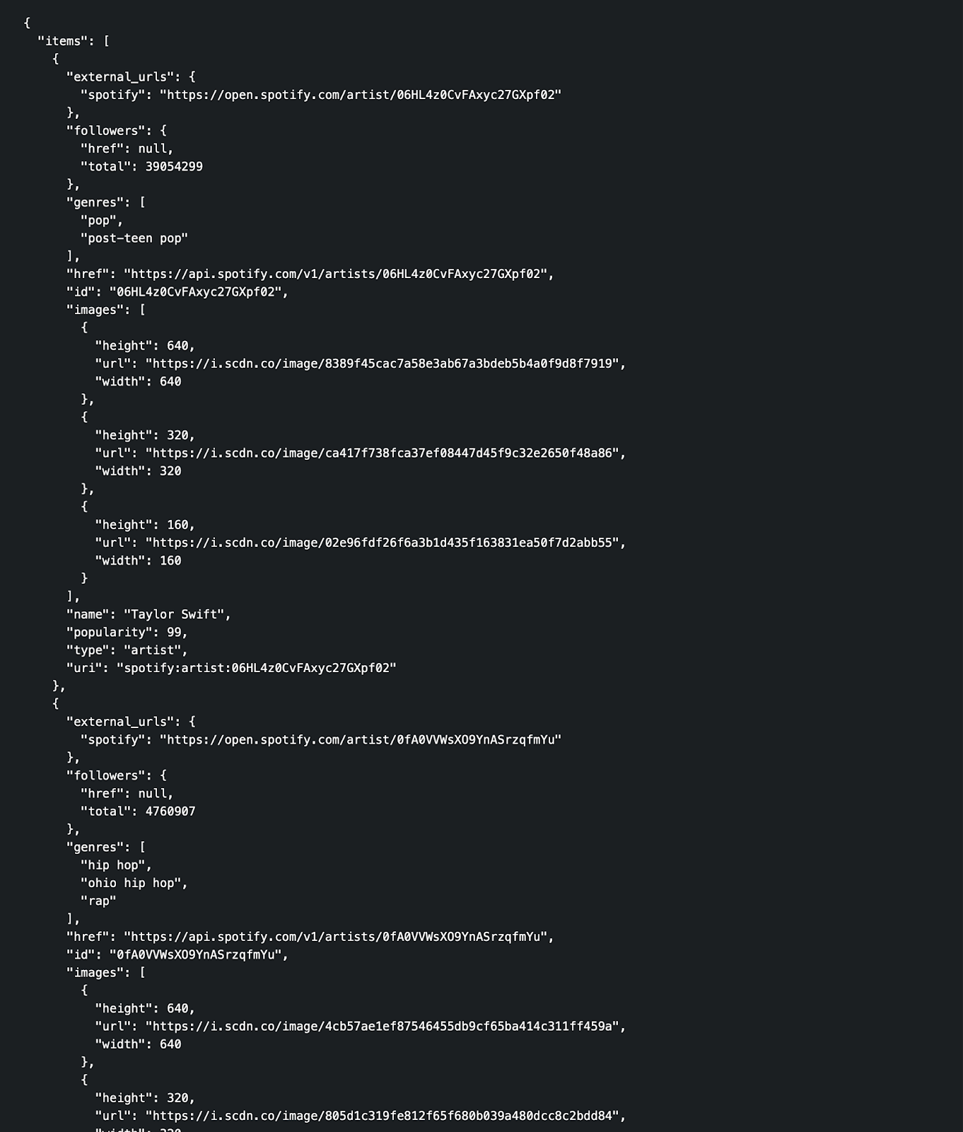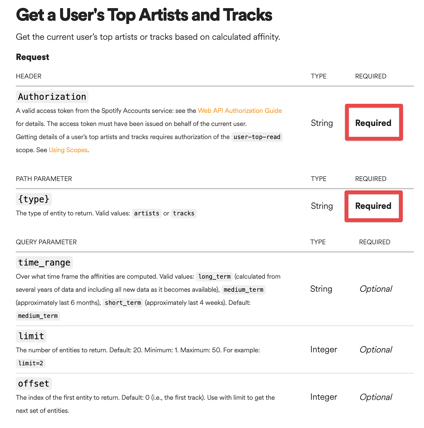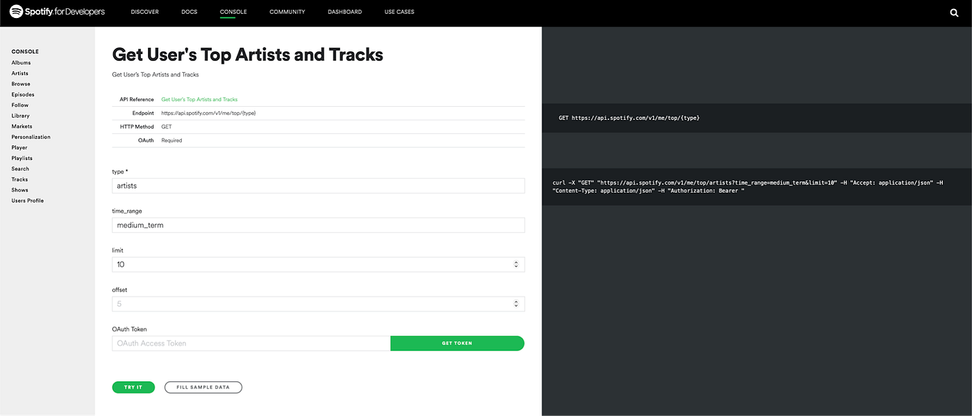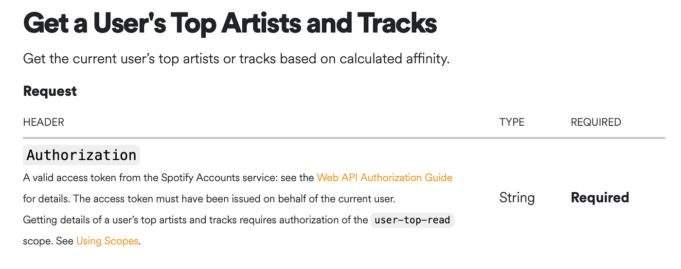 I found a very specific endpoint that is going to make our lives easy. We will use the Web API endpoint to get a user's top artists and tracks. There is not a ton of flexibility but it's perfect for this tutorial.
