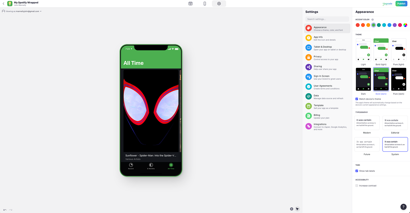 From there you can open up the settings option and beautify your app. I decided to keep the coloring consistent with Spotify brand colors. I am also a sucker for dark mode.