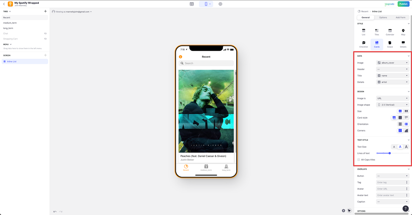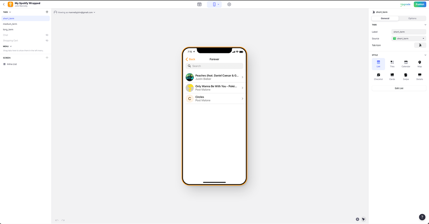 Glide is an awesome service for rendering apps from a Google sheet. For our use case, we are going to create a Spotify Wrapped app that has three tabs, one for each of the personalized time range.