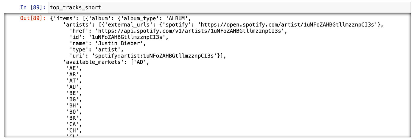sp = spotipy.Spotify(auth_manager=SpotifyOAuth(client_id=SPOTIPY_CLIENT_ID, client_secret=SPOTIPY_CLIENT_SECRET, redirect_uri=SPOTIPY_REDIRECT_URI, scope=SCOPE)) And from there lets reference the spotipy github again to see what function we should use. It looks like the current_user_top_tracks() function will get our top tracks.