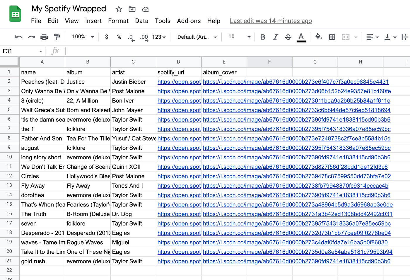 Make sure to choose your sheet that you dumped all the Spotify data to, likely called "My Spotify Wrapped". This is the same sheet we referenced with gspread earlier.