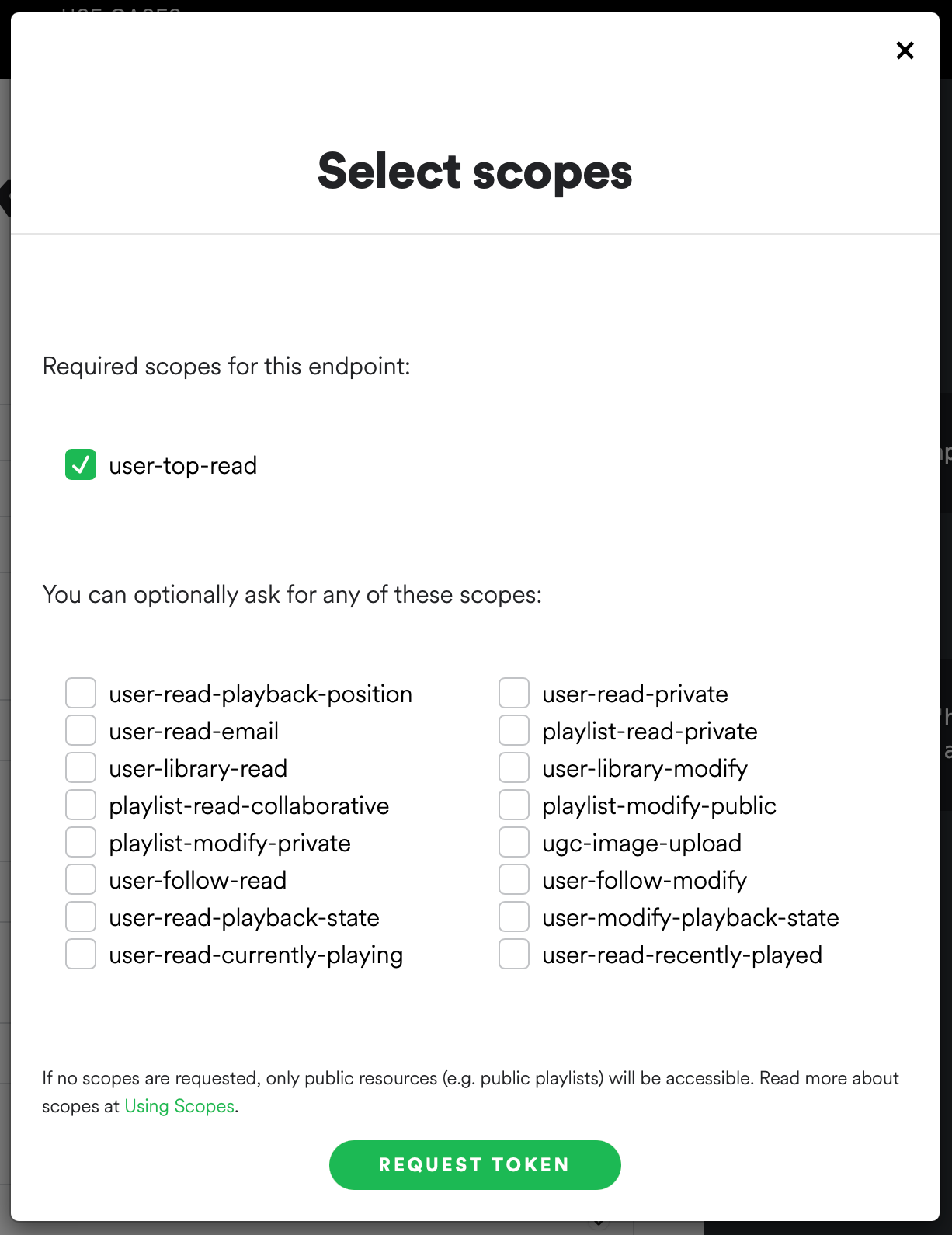 SCOPE = "user-top-read" You'll notice in the scope I set it equal to "user-top-read". How did I know which scope to use? Well spotify told me in their documentation
