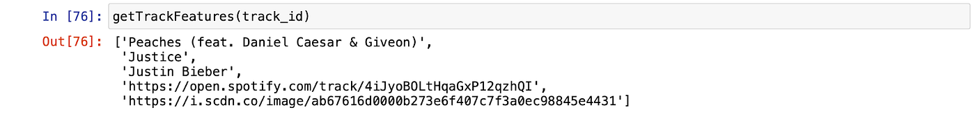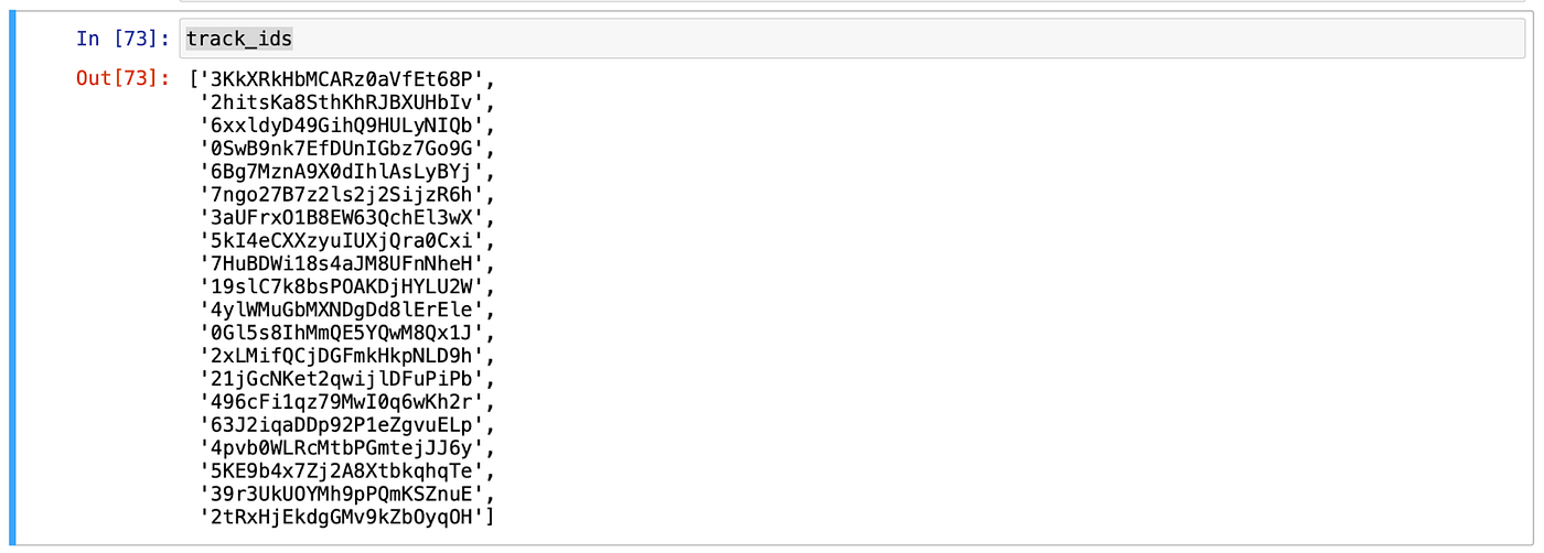 A list of Spotify track ids! Awesome. Now we need to get specific features for each of these track ids. One step at a time.