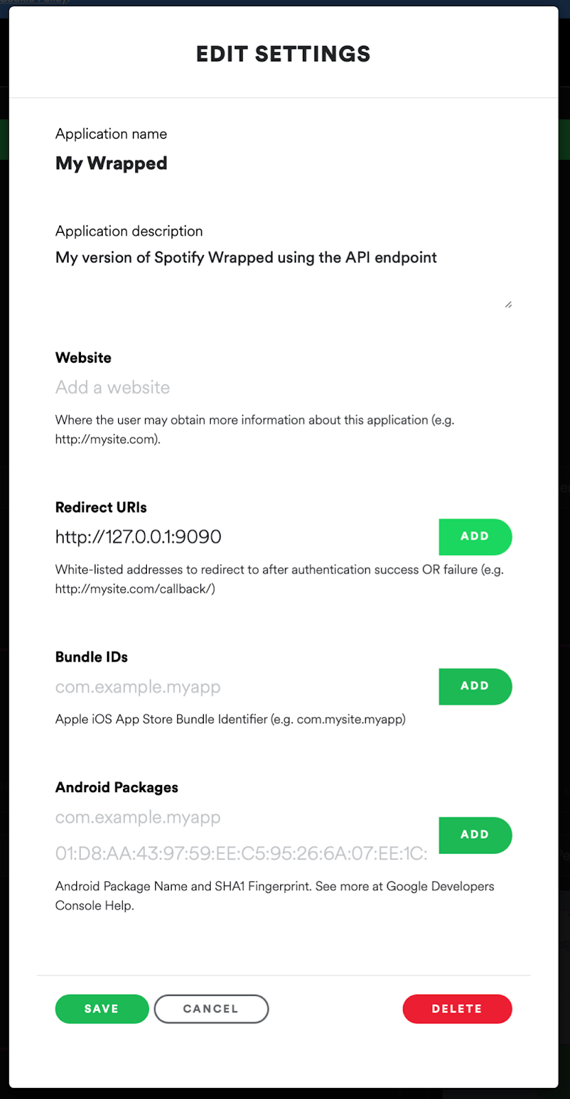 In our app settings we also need to whitelist a redirect URI. This will come in handy when authorizing our app. This URI enables the Spotify authentication service to automatically re-launch your app every time the user logs in.