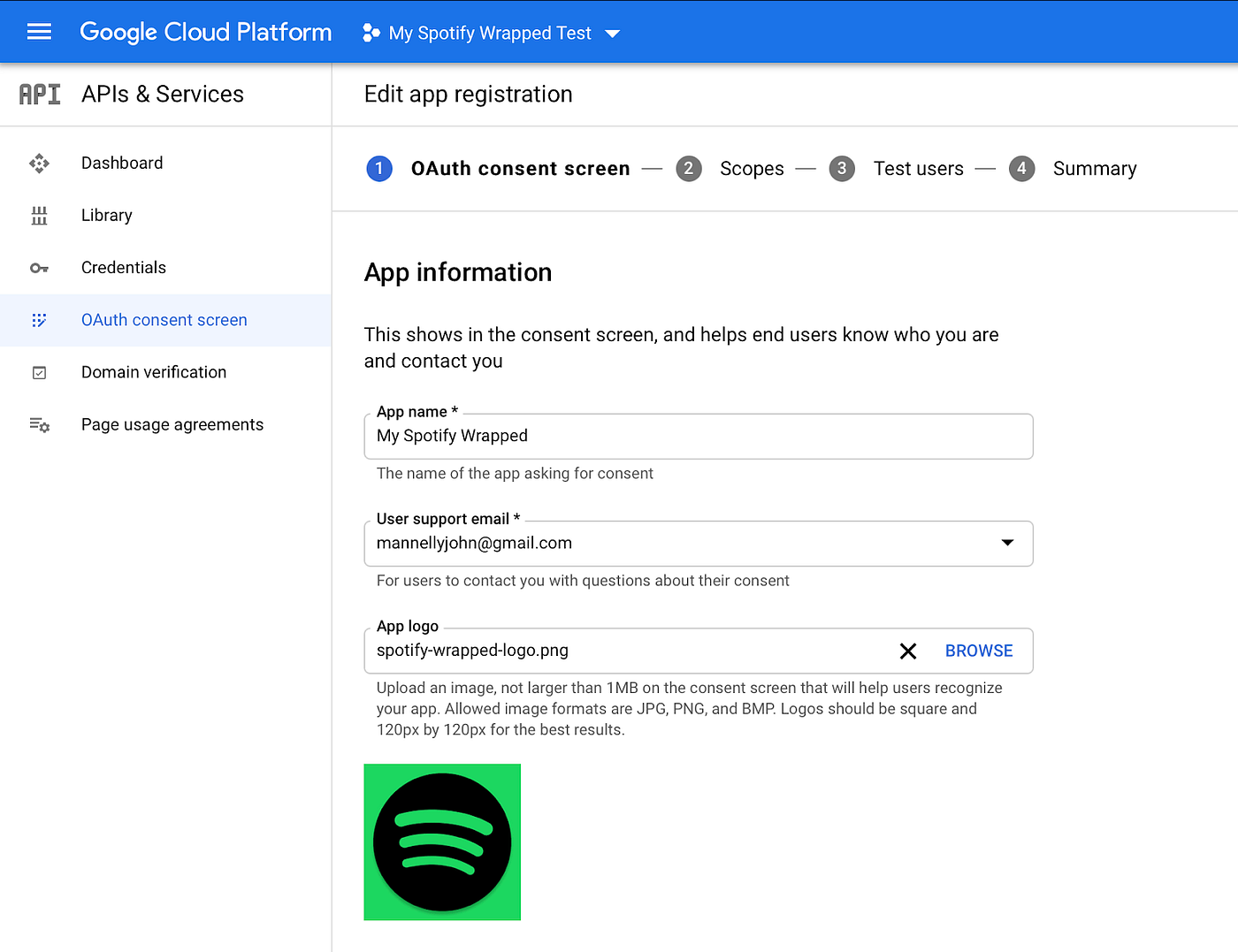 Go to "APIs & Services > OAuth Consent Screen." Click the button for "Configure Consent Screen" and follow the directions to give your app a name; you don't need to fill out anything else on that screen. Click Save.