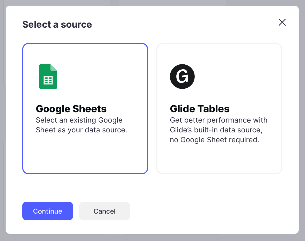 To start, create a Glide account and log in. From your dashboard you will want to create a new app and select Google Sheets at the source.