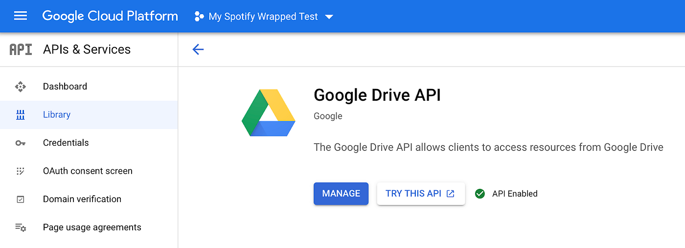 In the box labeled "Search for APIs and Services", search for "Google Drive API" and enable it.